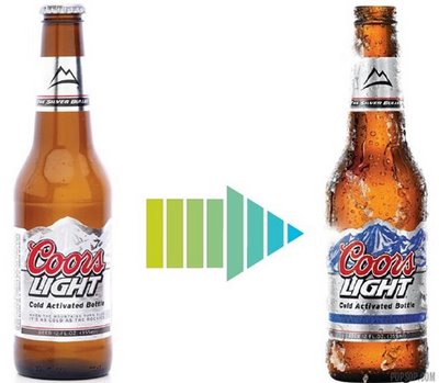 In the case of Coors beer, this is not exactly because, without the need to print any additional text, everyone who knows beer associates the color change with cold. The Coors Light beer label features mountains with silver trim.